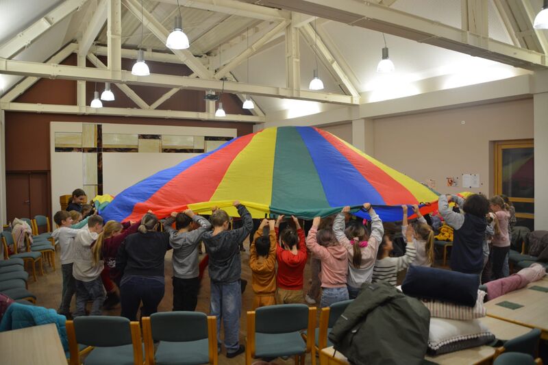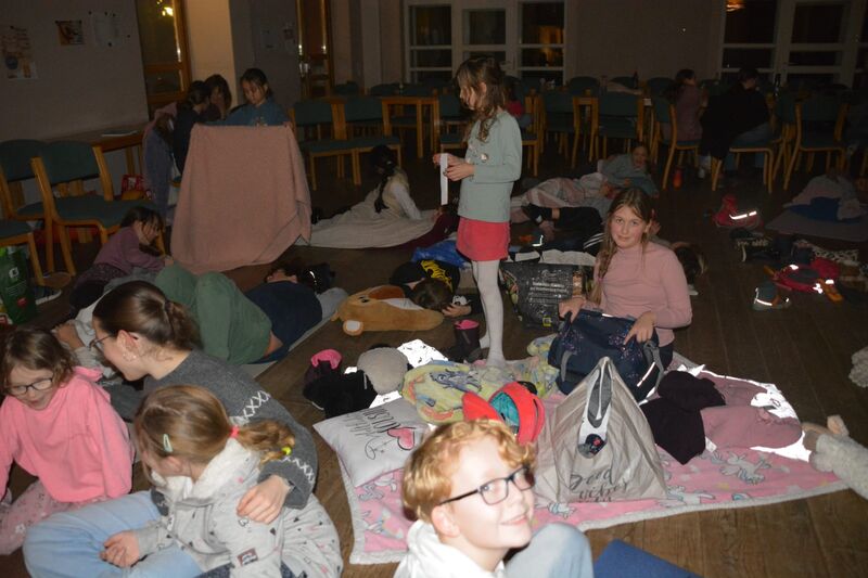 Dann ging es zum Spielen ins Gemeindehaus und um 18.00 Uhr gab es einen Guten-Abend-Snack. Weiter ging es gegen 19.00 Uhr mit Kuscheldecken auf die Matten zum Vorlesen, Spielen und Chillen.